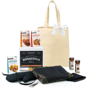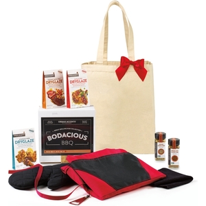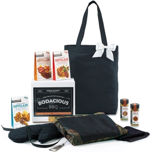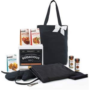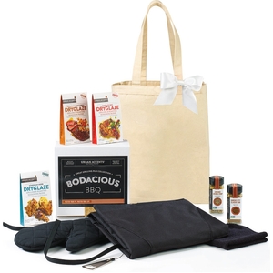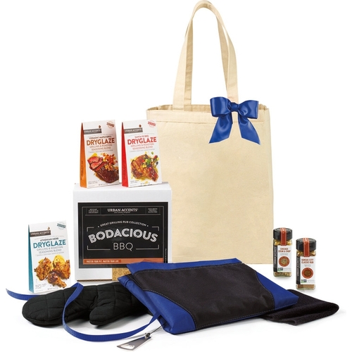 Show your appreciation for your customers and dedicated employees with a gift that evokes fun and relaxing BBQ vibes with friends and family on their downtime. , This flavorful gift includes bodacious artisan seasonings that every grill master needs to enjoy a delicious meal and a handy tricked out apron they will use again and again, Gift set includes the Grill Master Apron, Chicago Steak & Chop Seasoning, Kansas City Classic Rub, Athenian Herb Dryglaze, Vermont Grill Dryglaze, Santa Fe Dryglaze and our All Purpose Tote, Apron features detachable bottle opener, padded oven mitt and towel (towel size: 11" x 11") and multiple pockets for storage including insulated pocket for keeping beverage cold. Detachable neck strap and side tie strings. Machine washable, Chicago Steak & Chop: Ultimate windy city blend of sea salt, pepper, garlic & red pepper, Kansas City Classic Rub: Sweet & spicy grilling and roasting blends brown sugar, ancho, chipotle and allspice, Athenian Herb Dryglaze: Honey granules melt with thym