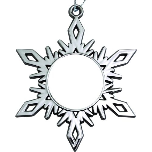 Snowflake Christmas Holiday Ornament. Die Cast Snowflake Shape with intricate pierced details in bright nickel finish. Includes a full color imprint w/ poly dome. Imprint area: 1" round. Includes silver metallic hanging cord and decorative gift envelope for easy holiday giving. Deluxe Velour gift pouch also available. Ornaments measure approximately 3" tall. Production time: 6 working days standard, 4 working day rush service also available. Also available in white finish.