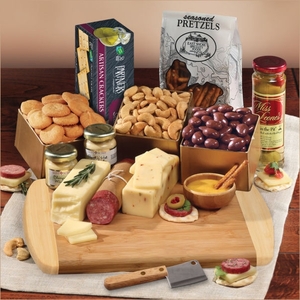 Let the snacking commence! The bamboo cutting board, firebranded with your imprint, comes packed with all of the delicious snack sensations you could want! Every recipient will appreciate your thoughtfulness as they enjoy this gourmet sampler, and every time they use the cutting board once the treats are gone.