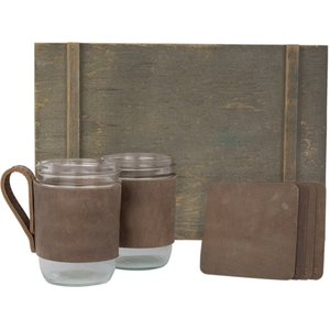 Thirsty for handcrafted promotional items that people will love? With our Double Barrel gift set, consider yourself quenched. This set will keep your customers hydrated in style and eliminate single-use plastics. Save the world, and make an impression. It's a win-win. Each package comes with two 16 oz. wide mouth mason jars wrapped in USA-made leather handled sleeves. It also includes leather coasters to complete the whole mason gift set for your company's best clients. Now that's refreshing. Choose custom leather colors to speak to your brand and add unique aesthetic appeal to every gift set. Add a foil imprint for an upcharge to create a set no one will ever forget.