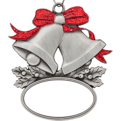 Holiday Ornaments in festive bell design. Features glitter enamel color fill on rich antique silver finish. Includes a full color imprint w/ epoxy dome and silver metallic hanging cord for easy Christmas Tree hanging or other holiday decoration. Ornament size approximately 2-1/2" high. Perfect for seasonal giving or holiday fundraisers. Production time: 6 working days standard. 4 day rush service available.Product is also available in Glitter Red color.
