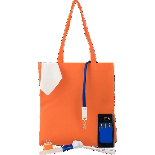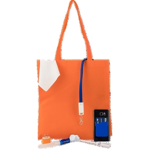 Kit includes: ECT - eco carry tote bag, 3IN1LANYARD - 3-in1 USB charging cable lanyard, PLUGNPOWER - plug-n-power USB wall charger, SW - smartphone wallet, SSHS - stick spray hand sanitizer, DSMCC - microfiber cleaning cloth, CUBIE - lip balm