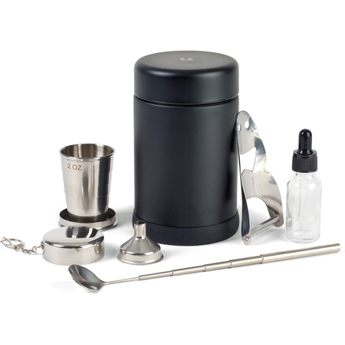 The Cocktail Canteen is an insulated cocktail shaker filled with all of the tools you need to make great drinks anywhere, anytime. Containing a collapsible jigger/shot glass, a telescoping bar spoon, a mini funnel, a TSA-compliant glass dropper bottle and a combo peeler/zesterthis multi-pack of portable tools is a must-have for committed cocktail enthusiasts and avid travelers. Hand wash only. BPA free. 10 oz. capacity
