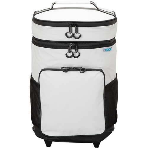 The iCOOL Lake Havasu Rolling Cooler Bag is perfect for camping, picnics, and beach trips. It has heat sealed PEVA lining and a 30-can capacity in the zippered main compartment. The bag flattens for storage and the bottom stiffener helps support the contents when full. Lift it with the top handle or extend the 36" locking telescoping handle and roll the bag to your destination. Easy-pull rubber loop zips make storing extra items or snacks in the front zippered pocket and the top zippered and insulated compartment simple, and carry your water bottles or other take-alongs in the side mesh pockets. Grab the iCOOL Lake Havasu Rolling Cooler Bag for your next excursion! A portion of all proceeds are donated to Shelter to Soldier, a non-profit organization that rescues dogs to train as service animals for veterans in need.